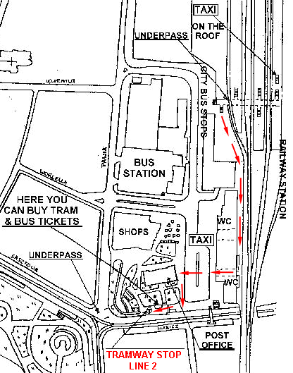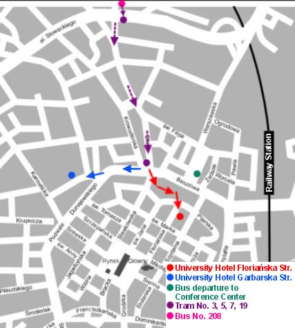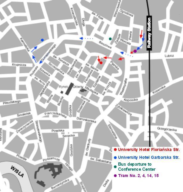 From the railway station to University Hotel at Garbarska Str.: Take tram No. 2, 4, 14 or 15 (see map how to get to the tram). Exit on the second tram stop, from there the hotel is in distance of about 300 m (see map).
