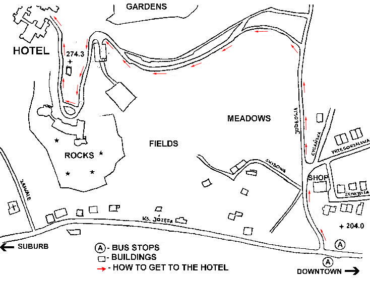 From the airport to Conference Center: Take bus No. 208 and exit on the next bus stop. Pass the street, there is another bus stop on the oposite site of the street. There take bus No. 209 going in direction SALWATOR. Than you should get off after about 15 minutes (ask someone to show you the right stop Przegorzaly). Then, after leaving the bus you will see the big building of the Conference Center situated at the top of the nearby hill on the left. Follow the side road, perpendicular to the main street. After some 200 m you will find the open Conference Center gate on the left. A little bit of climbing along a steep road brings you to the first buildings. Continue climbing to the top of the hill 100 m farther to find the Conference Center hotel and the conference hall (see map of walking way bus - Conference Center).